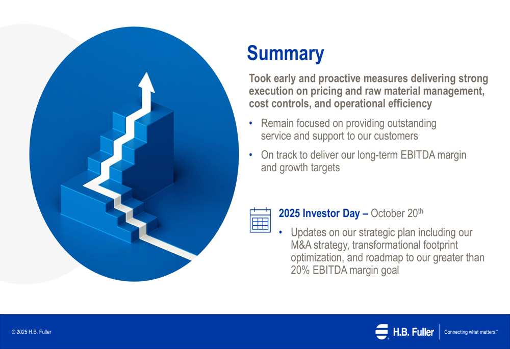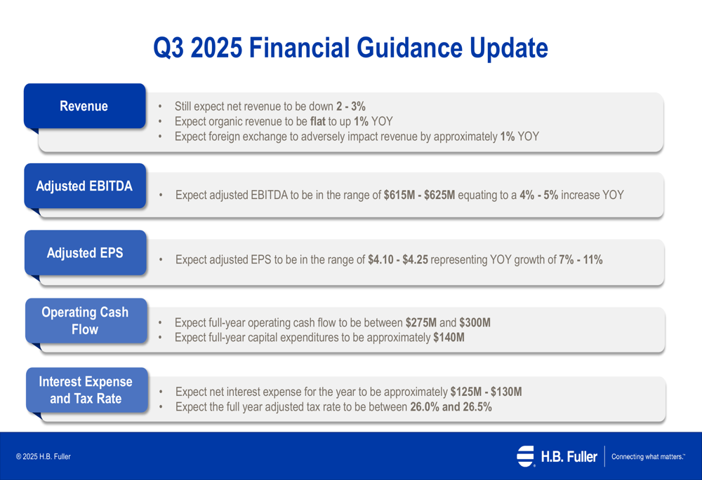 Olhando para o futuro, a H.B. Fuller ajustou sua orientação para o ano completo para refletir o ambiente econômico atual. A empresa agora espera que a receita líquida diminua entre 2-3% para o ano inteiro, com a receita orgânica projetada para ficar estável ou crescer até 1% em relação ao ano anterior. Prevê-se que a taxa de câmbio impacte negativamente a receita em aproximadamente 1%.