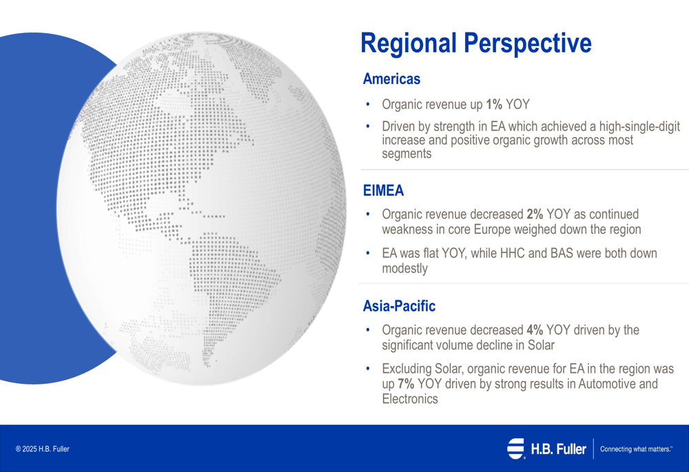 De uma perspectiva regional, a H.B. Fuller experimentou desempenho desigual em seus mercados globais. A região das Américas mostrou crescimento modesto com receita orgânica aumentando 1% em relação ao ano anterior, enquanto a EIMEA (Europa, Índia, Oriente Médio e África) registrou uma queda de 2% devido à fraqueza nos principais mercados europeus. A receita da Ásia-Pacífico diminuiu 4%, principalmente devido à fraqueza no setor solar, embora os segmentos automotivo e eletrônico tenham apresentado bom desempenho na região.