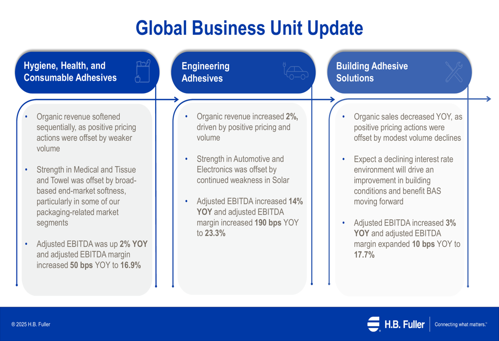 As três unidades de negócios globais da H.B. Fuller apresentaram crescimento positivo do EBITDA e expansão de margem, apesar do desempenho misto da receita. O segmento de Adesivos de Engenharia emergiu como o de melhor desempenho, com o EBITDA ajustado aumentando 14% em relação ao ano anterior e as margens expandindo 190 pontos base para 23,3%, impulsionado pela força nos mercados automotivo e eletrônico.