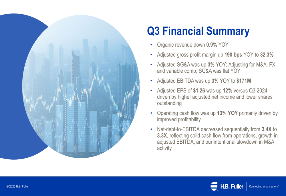 A H.B. Fuller reportou um EBITDA ajustado de US$ 171 milhões para o 3º tri de 2025, representando um aumento de 3% em relação ao ano anterior, enquanto a margem EBITDA ajustada expandiu 110 pontos base, alcançando 19,1%. O lucro por ação ajustado cresceu 12% para US$ 1,26, ligeiramente acima das expectativas dos analistas de US$ 1,25.