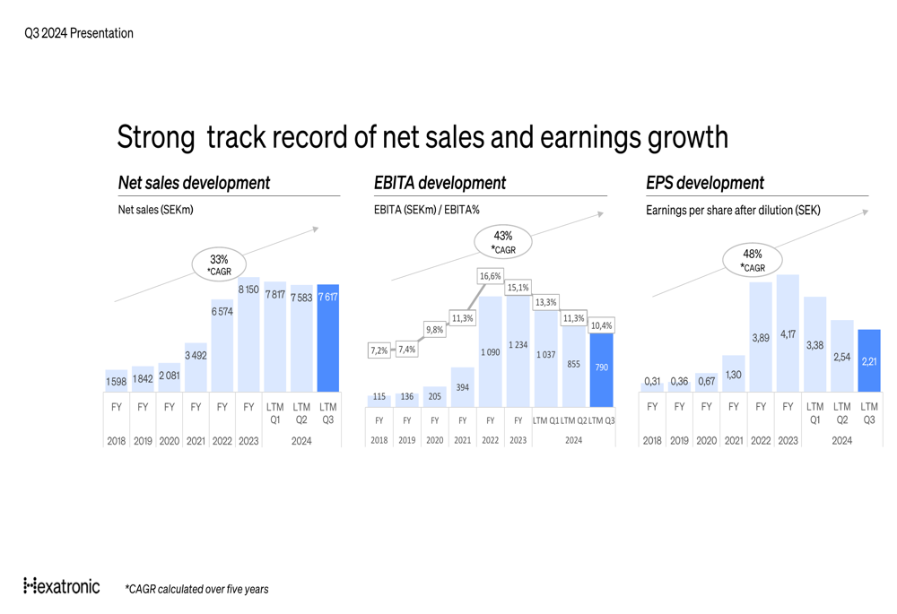 Observando o desempenho de longo prazo da empresa, a Hexatronic manteve taxas de crescimento impressionantes, com um CAGR de vendas de 5 anos de 33% e um CAGR de EBITA de 5 anos de 43%. O gráfico a seguir ilustra essa trajetória de crescimento:
