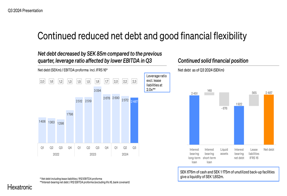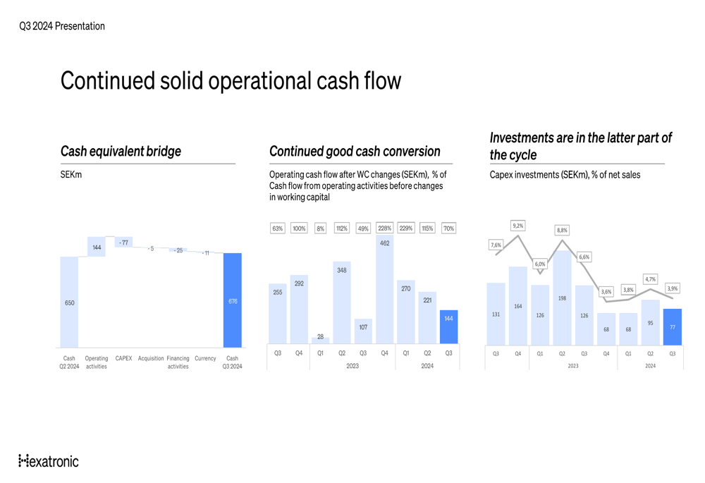 A Hexatronic manteve um sólido fluxo de caixa operacional no 3º tri de 2024, com fluxo de caixa das atividades operacionais atingindo SEK 144 milhões em comparação com SEK 107 milhões no mesmo período do ano passado. A conversão de caixa da empresa permaneceu forte em 70%.