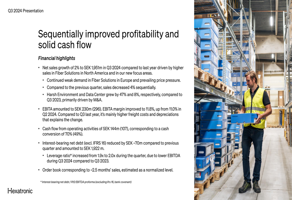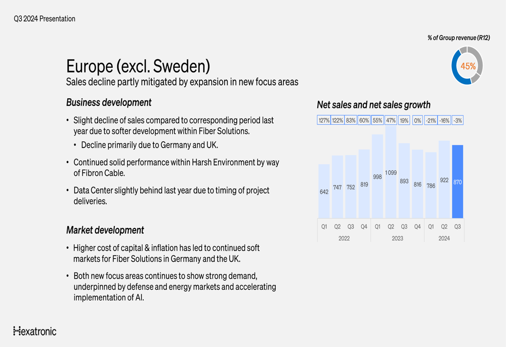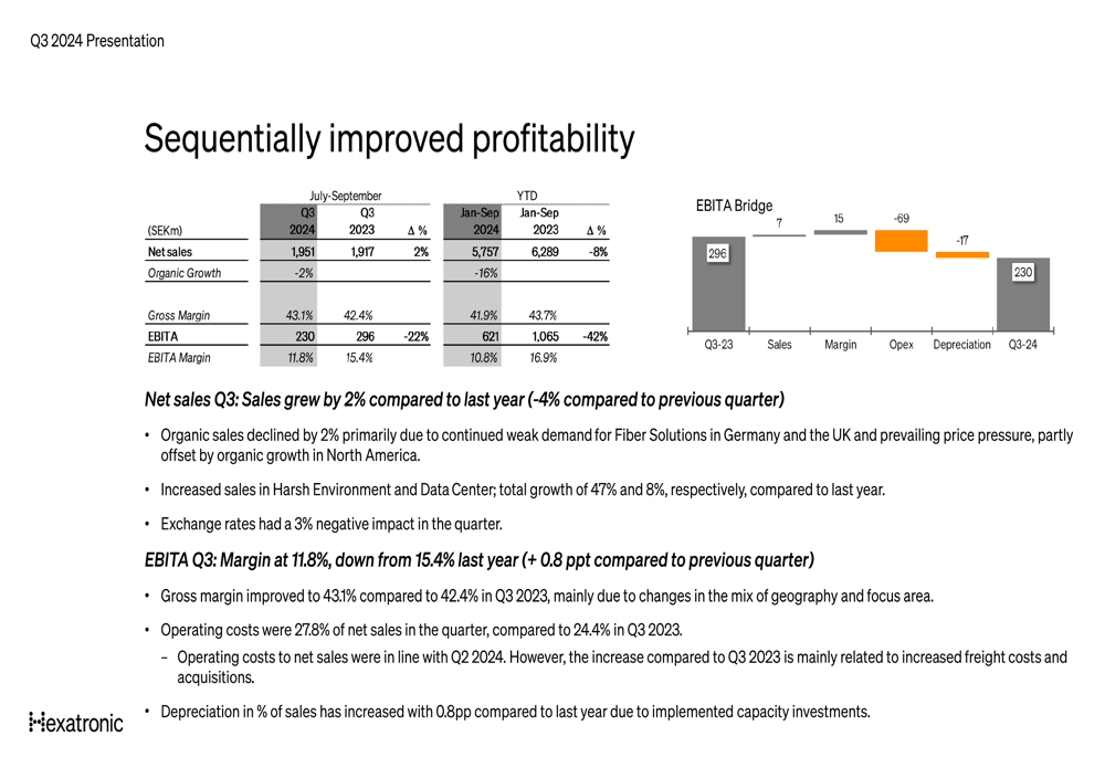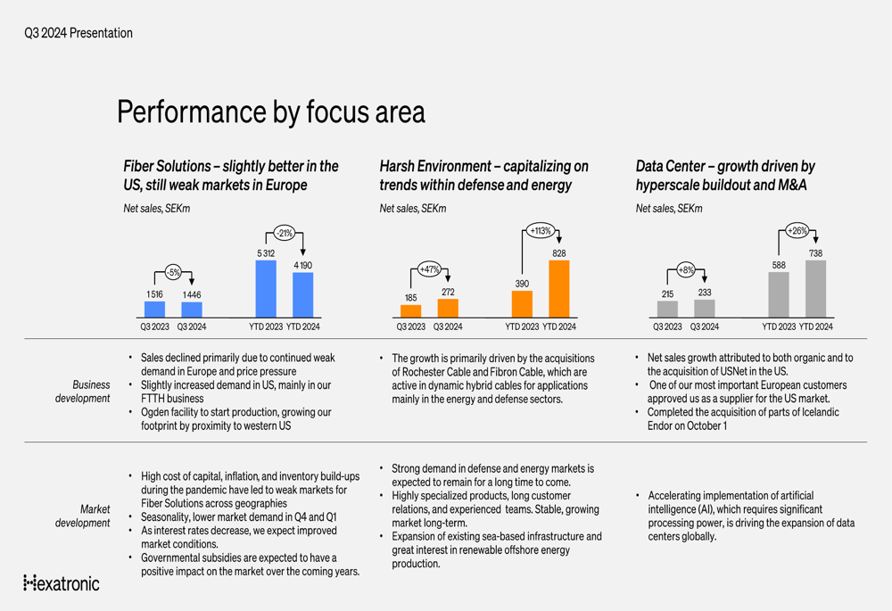 A Hexatronic reportou um crescimento de vendas líquidas de 2% para SEK 1.951 milhões no 3º tri de 2024, apesar da contínua demanda fraca em Soluções de Fibra em toda a Europa e pressão persistente sobre os preços. Em comparação com o trimestre anterior, as vendas diminuíram 4% sequencialmente.