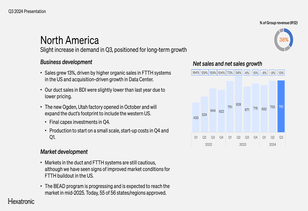 Em contraste, a América do Norte, representando 38% da receita do grupo, cresceu 13% no 3º tri, impulsionada por vendas orgânicas em sistemas FTTH:
