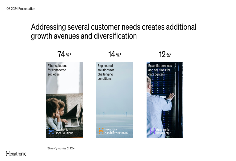 O negócio da Hexatronic está cada vez mais diversificado em três áreas principais: Soluções de Fibra (74% das vendas do grupo), Soluções de Engenharia para condições desafiadoras (14%) e Soluções para data centers (12%).