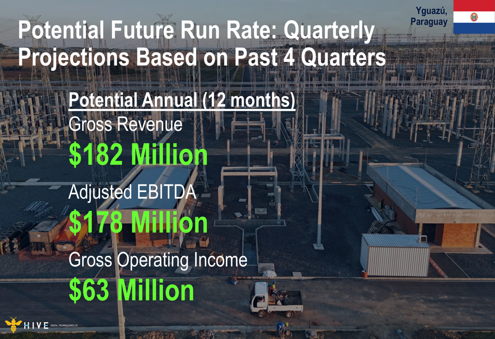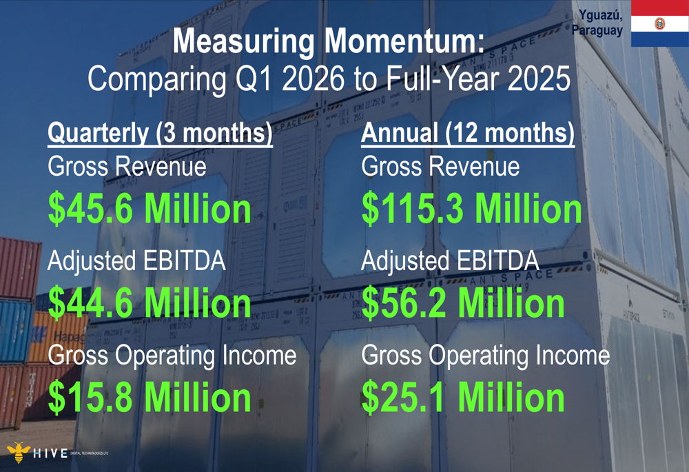Com base em seu desempenho no 1º tri de 2026, a HIVE projeta taxas anuais potenciais de US$ 182 milhões em receita bruta, US$ 178 milhões em EBITDA ajustado e US$ 63 milhões em receita operacional bruta. Essas projeções representam um crescimento significativo em comparação aos resultados anuais completos de 2025.