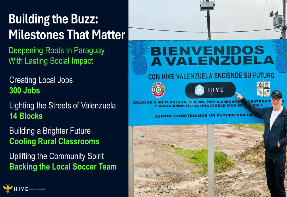 As iniciativas de impacto social da HIVE no Paraguai incluem a criação de 300 empregos locais, melhoria da iluminação pública em Valenzuela, refrigeração de salas de aula rurais e apoio a times esportivos locais. Esses esforços demonstram o compromisso da empresa com o desenvolvimento sustentável e o engajamento comunitário.