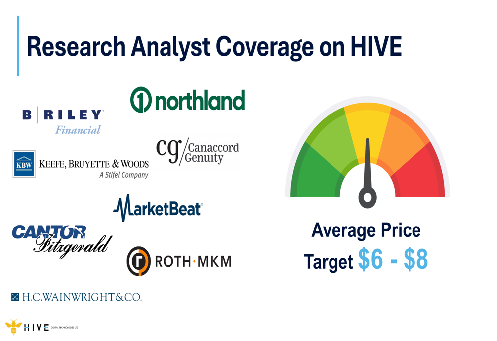 A apresentação da HIVE incluiu uma visão geral da cobertura de analistas de várias empresas financeiras, incluindo B. Riley Financial, Northland, KBW, Canaccord Genuity, MarketBeat, ROTH MKM e H.C. Wainwright & Co. O preço-alvo médio desses analistas varia entre US$ 6 e US$ 8, sugerindo potencial de valorização a partir dos níveis atuais, apesar do ganho de 143% das ações no acumulado do ano.