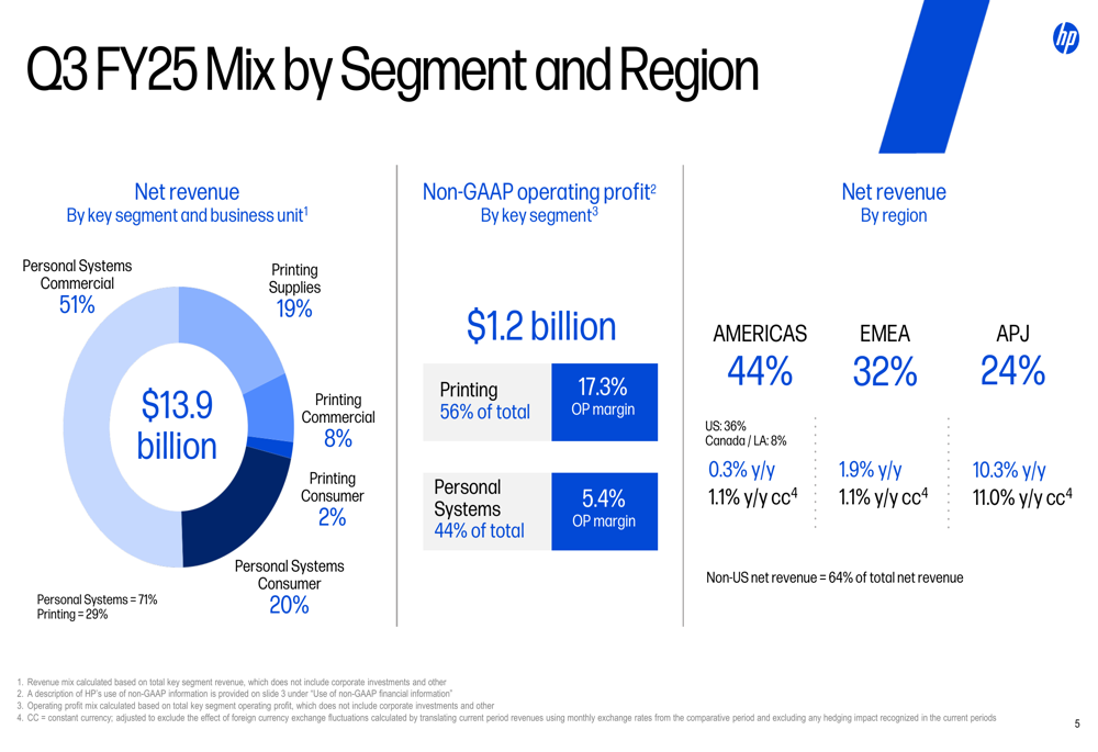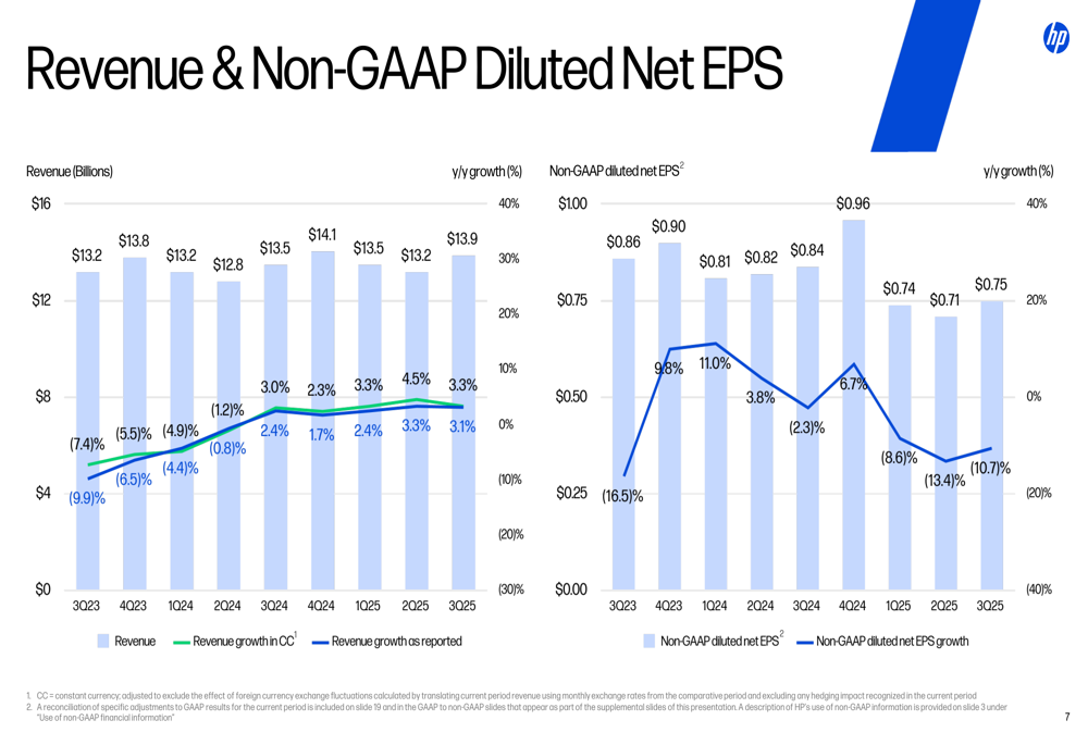 A HP entregou US$ 13,9 bilhões em receita líquida para o 3º tri do ano fiscal de 2025, representando um aumento de 3% tanto em termos nominais quanto em moeda constante em comparação com o mesmo período do ano anterior. O lucro por ação não-GAAP diluído foi de US$ 0,75, dentro da faixa de perspectiva previamente fornecida pela empresa de US$ 0,68 a US$ 0,80 por ação. O LPA diluído GAAP superou as expectativas em US$ 0,80, ultrapassando a perspectiva de US$ 0,57 a US$ 0,69 por ação.