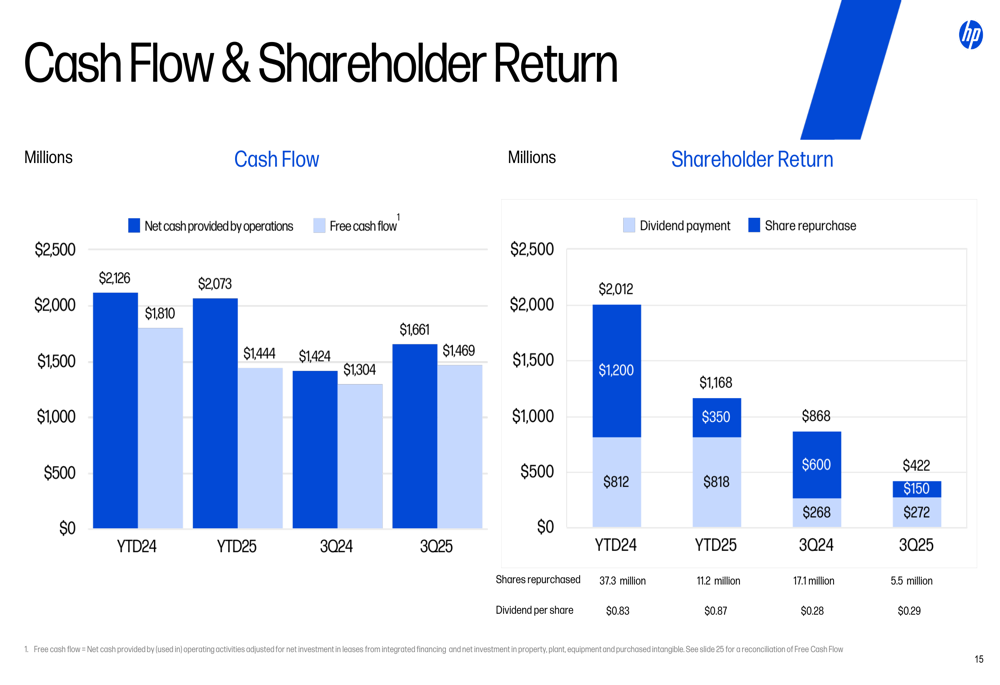 A geração de fluxo de caixa permaneceu forte com US$ 1,5 bilhão em fluxo de caixa livre para o trimestre. No acumulado do ano, a HP gerou US$ 1,7 bilhão em fluxo de caixa livre, ligeiramente abaixo dos US$ 1,8 bilhão no período comparável do ano anterior. A empresa retornou US$ 0,4 bilhão aos acionistas no 3º tri, incluindo US$ 0,3 bilhão em dividendos e US$ 0,1 bilhão em recompras de ações. O dividendo trimestral foi de US$ 0,29 por ação, acima dos US$ 0,28 do ano anterior.