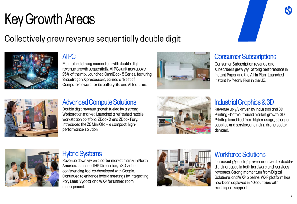 A empresa destacou o impulso dos PCs com IA, observando que esses dispositivos agora representam mais de 25% do mix de PCs, com crescimento de receita sequencial de dois dígitos. Inovações de produtos como o EliteBook Ultra e o OmniBook 5 com bateria de 34 horas foram destacados como diferenciais competitivos.