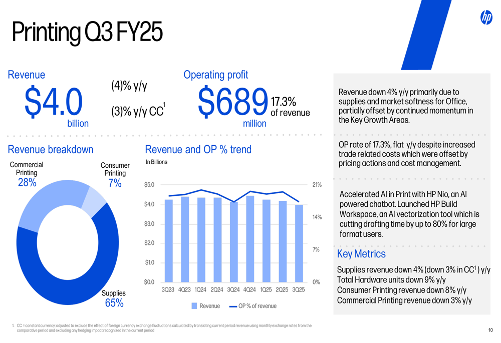 O segmento de Impressão continuou enfrentando desafios estruturais, com o total de unidades de hardware diminuindo 9% em relação ao ano anterior. A receita de suprimentos, que representa 65% da receita do segmento, diminuiu 4% (3% em moeda constante). A receita de impressão para consumidores caiu 8%, enquanto a receita de impressão comercial diminuiu 3%.