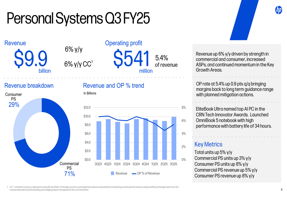 O segmento de Sistemas Pessoais da HP mostrou força generalizada nos mercados comercial e consumidor. O total de unidades aumentou 5% em relação ao ano anterior, com unidades comerciais subindo 3% e unidades de consumo crescendo 8%. O crescimento da receita foi igualmente equilibrado, com a receita comercial aumentando 5% e a receita de consumo crescendo 8%.