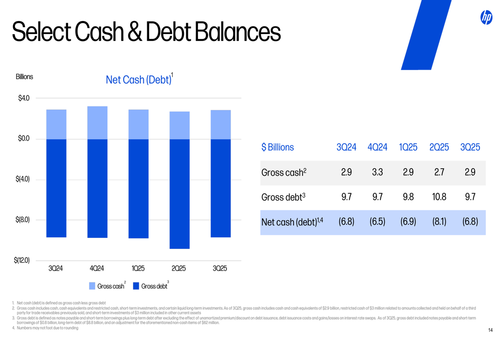 A HP manteve uma posição financeira estável com caixa bruto de US$ 2,9 bilhões no final do 3º tri do ano fiscal de 2025, inalterado em relação ao mesmo período do ano anterior. A dívida bruta ficou em US$ 9,7 bilhões, resultando em uma posição de dívida líquida de US$ 6,8 bilhões. A posição de dívida da empresa flutuou um pouco nos últimos trimestres, mas permanece em níveis semelhantes aos do ano anterior.