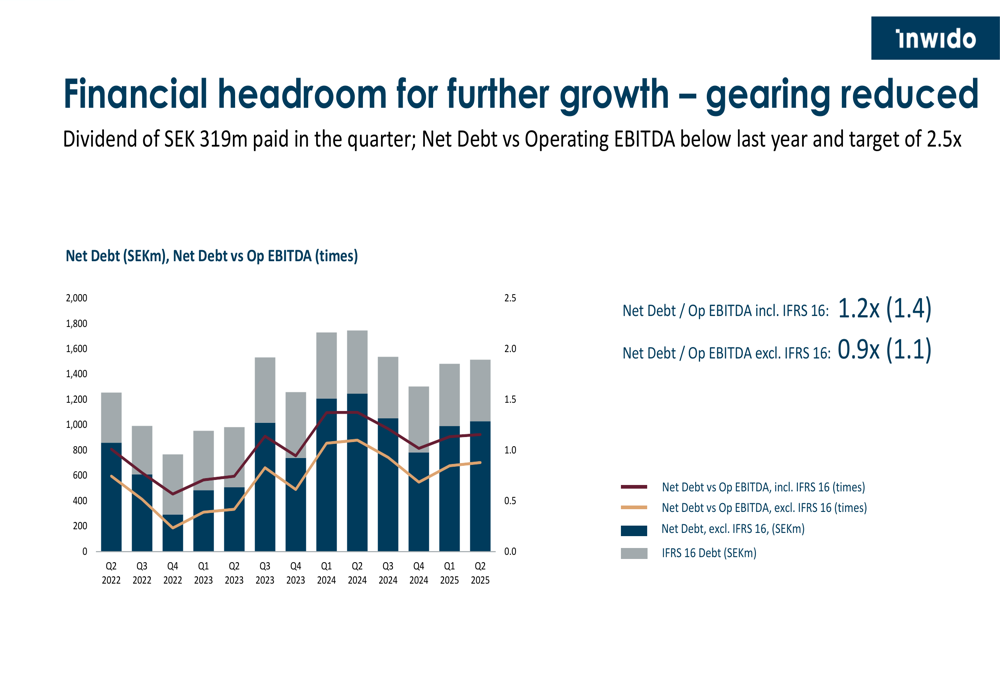 A dívida líquida em relação ao EBITDA operacional melhorou para 1,2x, comparado a 1,4x no ano passado, ou 0,9x excluindo os efeitos do IFRS 16 (redução de 1,1x). Esta melhoria ocorreu apesar do pagamento de dividendos de SEK 319 milhões durante o trimestre, proporcionando à Inwido margem financeira adicional para futuras iniciativas de crescimento.