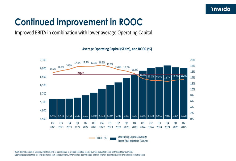 O lucro após impostos aumentou para SEK 165 milhões, comparado a SEK 154 milhões no 2º tri de 2024, resultando em um crescimento do lucro por ação de 6,7% para SEK 2,69. O retorno sobre o capital operacional (ROOC) da empresa melhorou para 13,4% em relação aos 13,1% do ano anterior.
