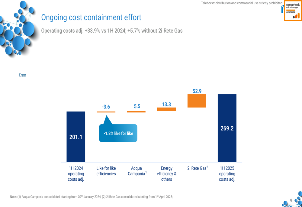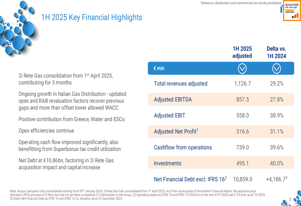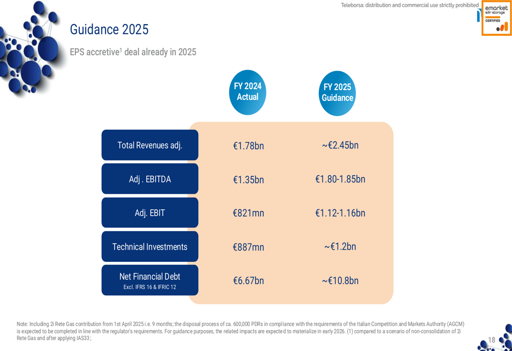 A empresa também destacou desenvolvimentos regulatórios importantes, incluindo a extensão do período regulatório atual por dois anos até o final de 2027 (resolução ARERA 221/2025/R/Gas). Além disso, um processo de alienação antitruste está em andamento, com ofertas vinculativas esperadas até 5 de setembro.