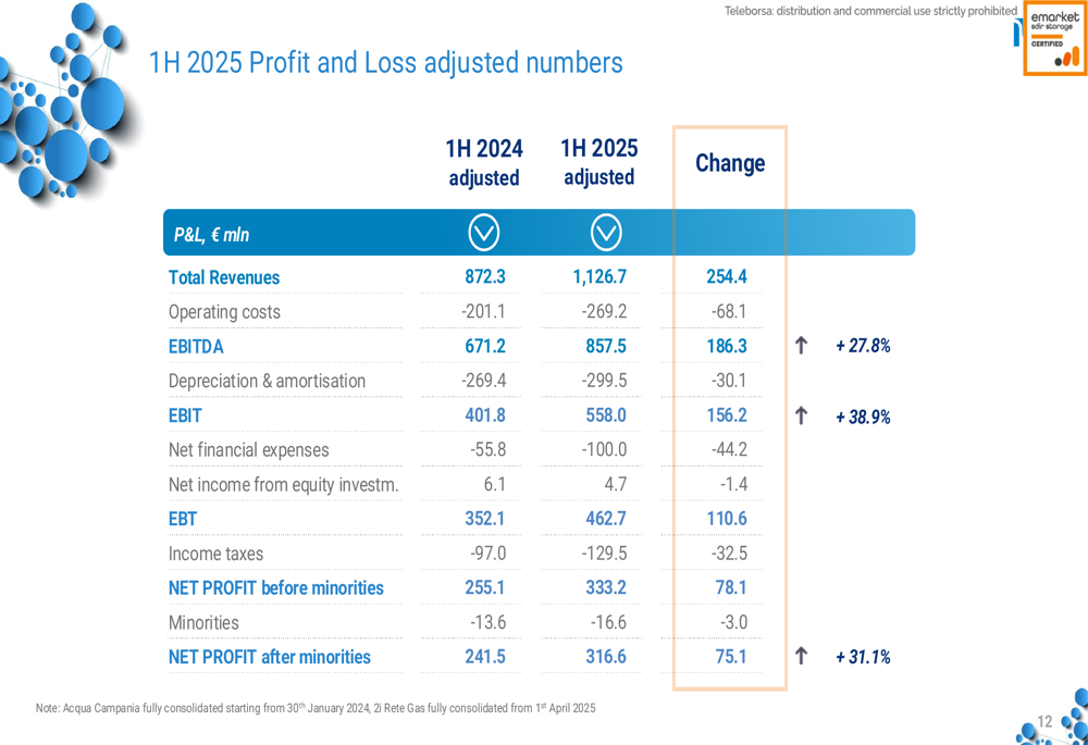 A Italgas reportou resultados financeiros robustos para o primeiro semestre de 2025, com lucro líquido ajustado aumentando 31,1% em relação ao ano anterior, atingindo €316,6 milhões. Este forte desempenho foi atribuído em grande parte à consolidação da 2i Rete Gas, que foi concluída antes do previsto em 1º de abril de 2025, contribuindo por três meses para os resultados do primeiro semestre.