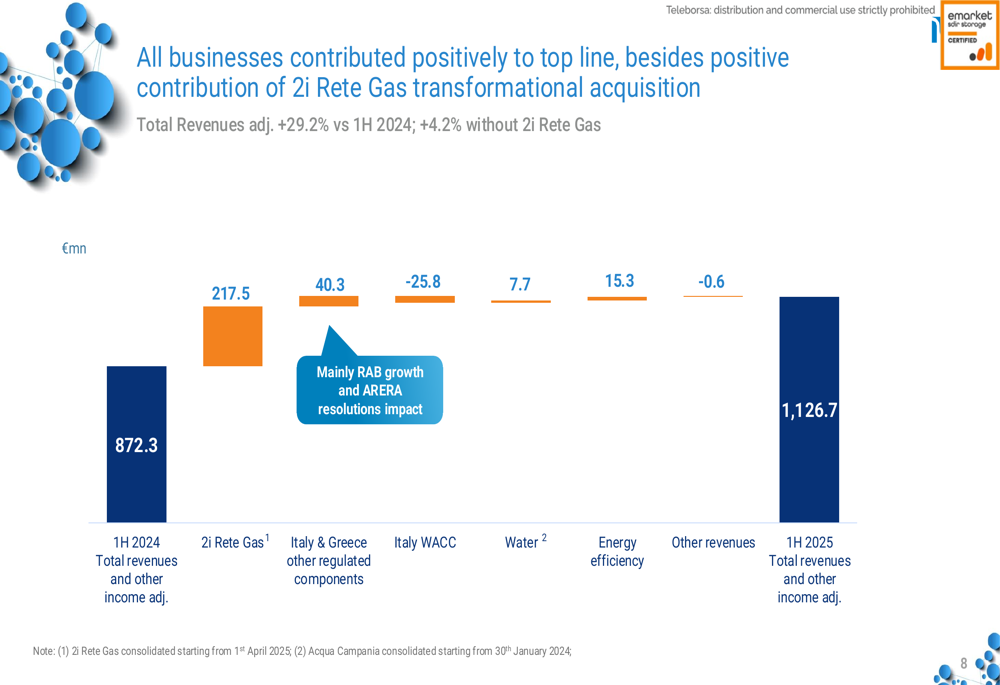 A aquisição da 2i Rete Gas foi o principal impulsionador do crescimento em todos os indicadores financeiros, embora a Italgas também tenha demonstrado crescimento orgânico. Sem a contribuição da 2i Rete Gas, a receita total ainda teria aumentado 4,2%, enquanto o EBITDA ajustado teria crescido 3,2%.