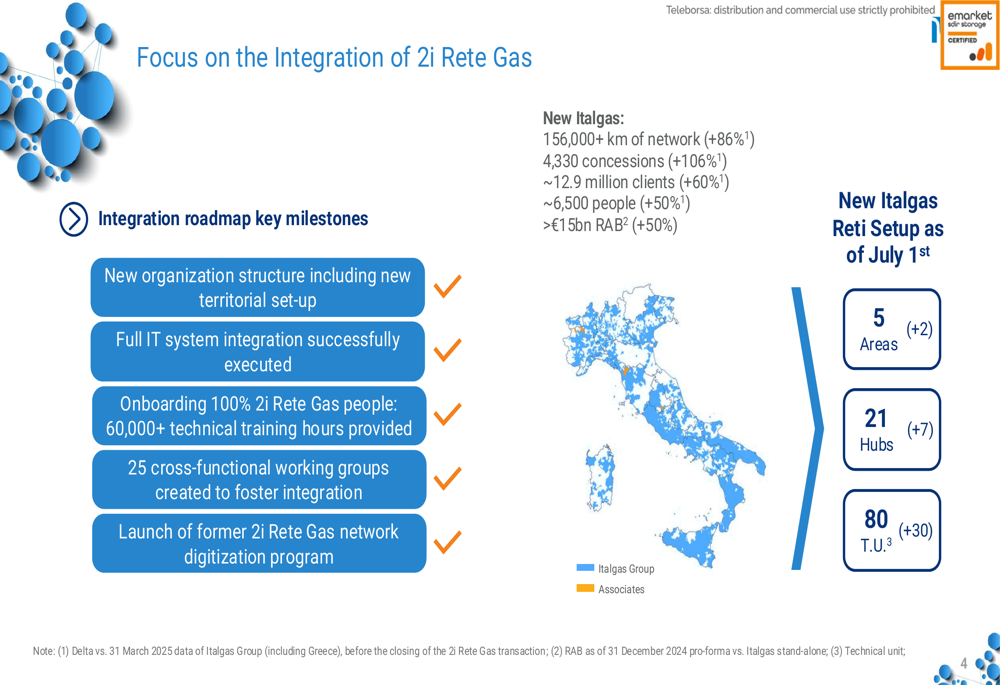A Italgas fez progressos substanciais na integração da 2i Rete Gas, concluindo a fusão por incorporação na Italgas Reti em 1º de julho de 2025. Os esforços de integração incluíram: