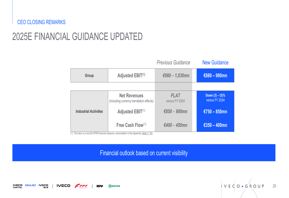 A Iveco revisou sua orientação financeira para o ano completo de 2025, reduzindo as expectativas devido a uma recuperação progressiva mais lenta da indústria no segmento de veículos comerciais leves e incertezas macroeconômicas contínuas: