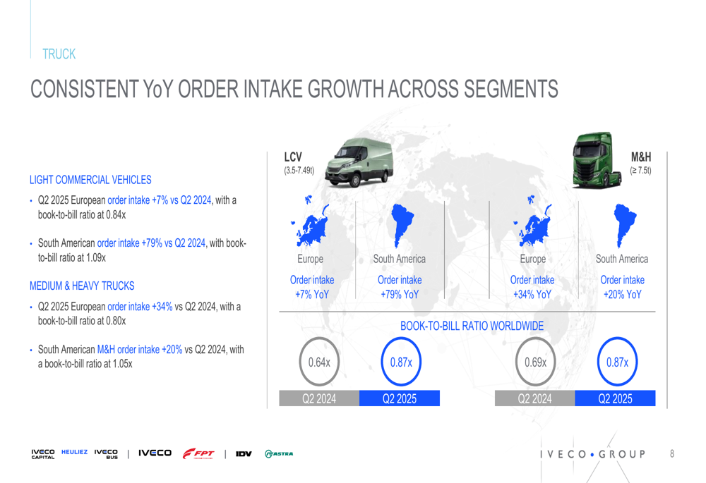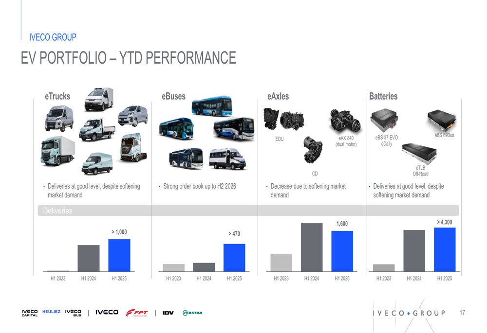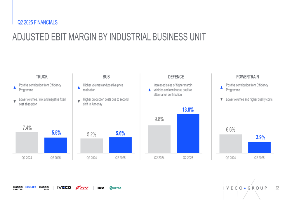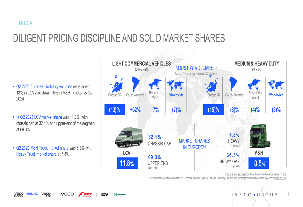 O desempenho da Iveco mostrou variação significativa entre os segmentos de negócios. A divisão de caminhões, que representa a maior parte da receita, enfrentou dificuldades com volumes da indústria europeia caindo 13% em veículos comerciais leves e 15% em caminhões médios e pesados em comparação com o 2º tri de 2024.