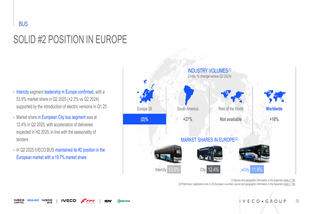 No segmento de ônibus, a Iveco confirmou sua sólida posição de número 2 na Europa com uma participação de mercado de 19,7%. A empresa demonstrou força particular no segmento interurbano, onde manteve a liderança com uma participação de mercado de 53,9%, representando um aumento de 2,3% em comparação com o 2º tri de 2024.