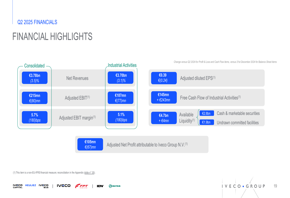 O Iveco Group reportou receitas líquidas consolidadas de € 3,78 bilhões no 2º tri de 2025, representando uma queda de 3,5% em comparação com o mesmo período de 2024. O EBIT ajustado foi de € 215 milhões com margem de 5,7%, abaixo dos 7,5% no 2º tri de 2024, refletindo condições desafiadoras de mercado, particularmente no segmento de caminhões.