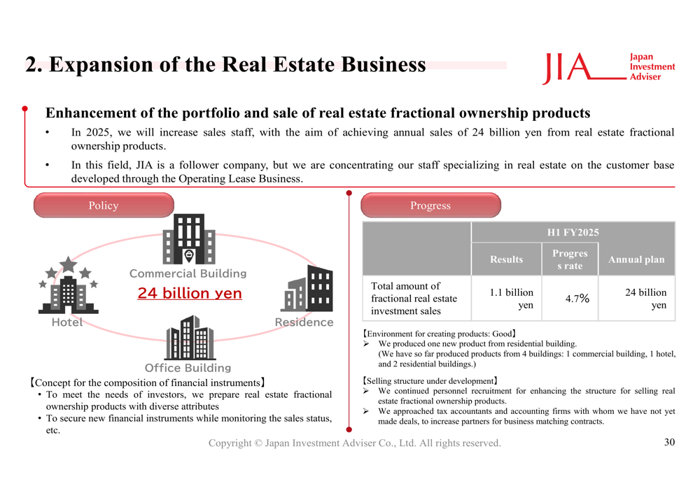 No Negócio Imobiliário, a Japan Investment Adviser está expandindo seu portfólio e vendas de produtos de propriedade fracionada de imóveis, com uma meta de vendas de ¥24 bilhões para o ano fiscal completo: