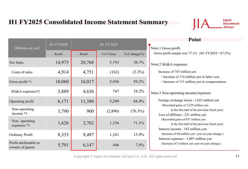 Como mostrado na tabela de destaques financeiros a seguir, a empresa alcançou vendas recordes de ações de ¥76.957 milhões, um aumento de 25,4% em comparação com o mesmo período do ano passado: