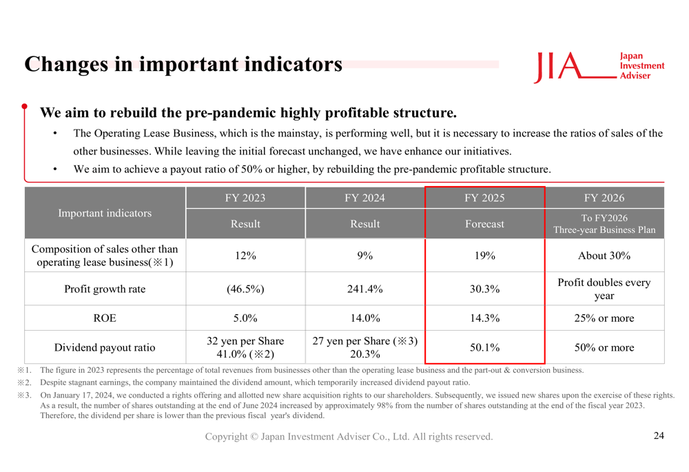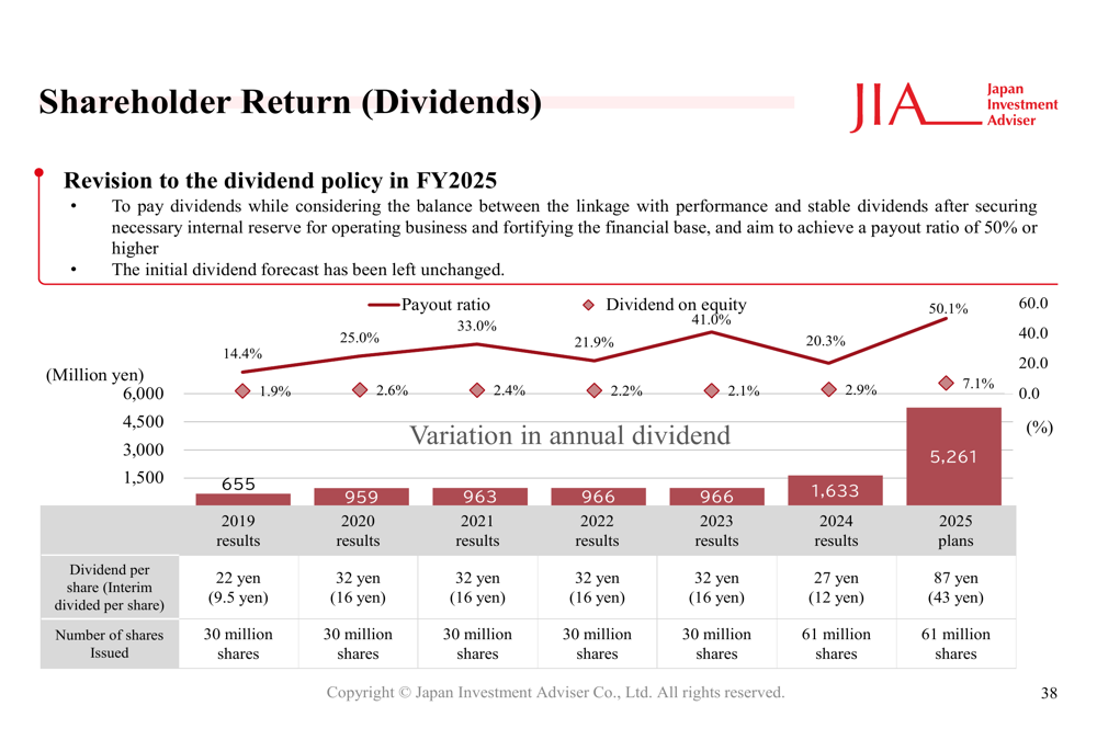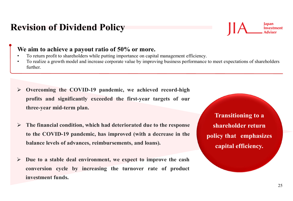 A Japan Investment Adviser revisou sua política de dividendos com o objetivo de alcançar um índice de pagamento de 50% ou mais, enfatizando a eficiência na gestão de capital enquanto apoia o modelo de crescimento da empresa: