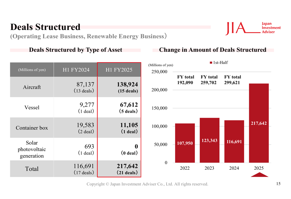 As atividades de estruturação de negócios da empresa mostraram forte impulso em vários tipos de ativos. Como ilustrado no gráfico a seguir, o valor total de negócios estruturados no primeiro semestre do ano fiscal de 2025 alcançou ¥122.830 milhões, com aeronaves representando a maior parte: