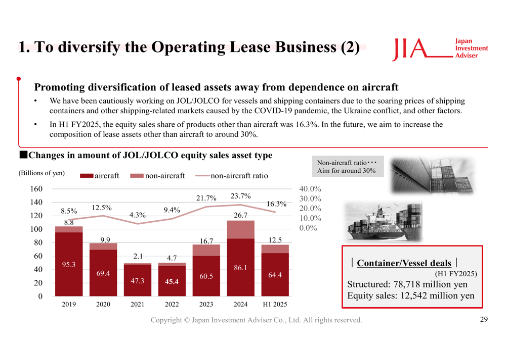 A Japan Investment Adviser delineou três pontos estratégicos principais para 2025: diversificar o Negócio de Leasing Operacional, expandir o Negócio Imobiliário e ampliar seu portfólio de negócios geral. A empresa está trabalhando ativamente para reduzir sua dependência do leasing de aeronaves, aumentando a proporção de ativos não relacionados a aeronaves em seu portfólio.