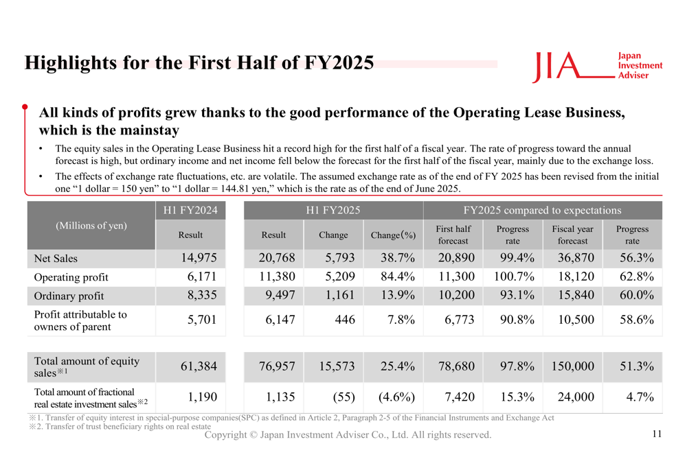 A Japan Investment Adviser Co., Ltd. (TSE:7172) reportou um crescimento excepcional nos resultados financeiros do primeiro semestre do ano fiscal de 2025, impulsionado principalmente por vendas recordes de ações em seu Negócio de Leasing Operacional. A empresa de serviços financeiros sediada em Tóquio, que se especializa em fornecer soluções financeiras abrangentes centradas em leasing operacional, apresentou seus resultados em 31.07.2025.