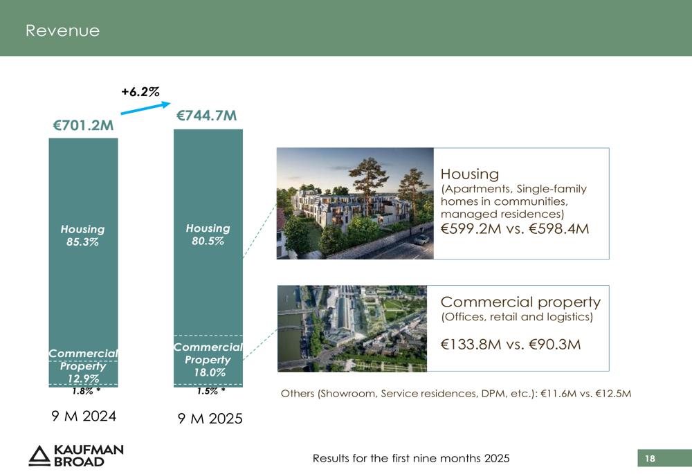 A receita total da Kaufman & Broad para os primeiros nove meses de 2025 alcançou €744,7 milhões, um aumento de 6,2% em relação aos €701,2 milhões no mesmo período de 2024. O setor habitacional permaneceu como o maior contribuinte com 80,5% da receita (€599,2 milhões), enquanto as propriedades comerciais representaram 18%.
