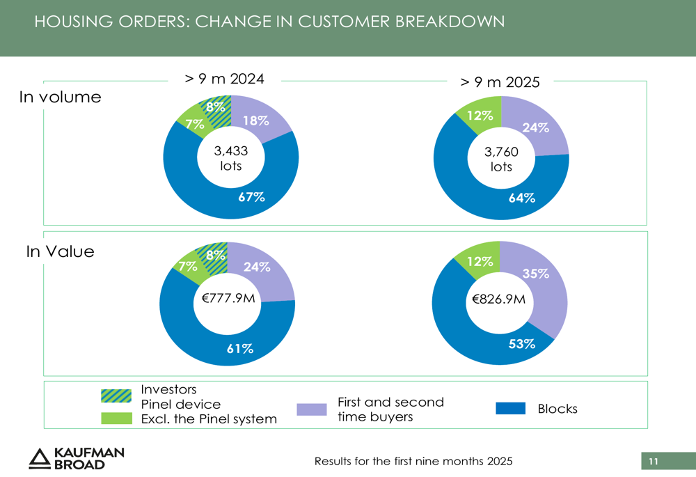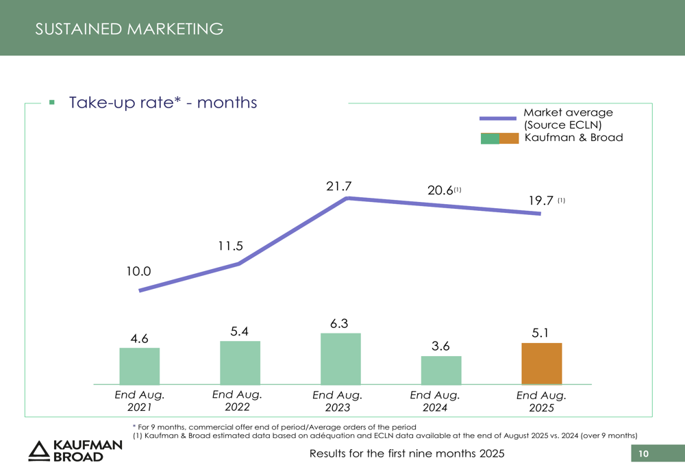 A Kaufman & Broad reportou pedidos de habitação de 3.760 unidades para os primeiros nove meses de 2025, representando um aumento de 9,5% em relação ao mesmo período de 2024. O valor desses pedidos subiu para €826,9 milhões, um aumento de 6,3% em relação ao ano anterior.