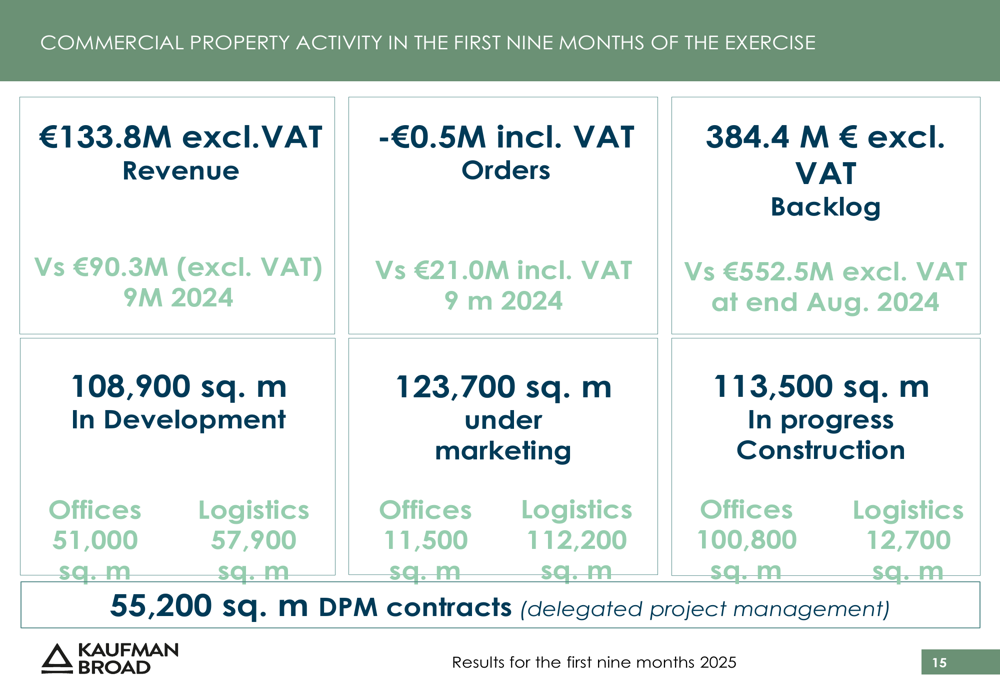 A empresa relatou ter 108.900 metros quadrados em desenvolvimento, 123.700 metros quadrados em comercialização e 113.500 metros quadrados em construção. A carteira de pedidos de propriedades comerciais ficou em €384,4 milhões, abaixo dos €552,5 milhões do final de agosto de 2024.