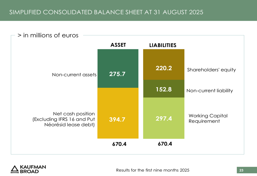 A Kaufman & Broad manteve uma forte posição financeira com patrimônio líquido de €220,2 milhões e uma robusta posição de caixa líquido de €394,7 milhões (excluindo IFRS 16 e dívida de arrendamento Put Néorésid). O sólido balanço da empresa é refletido na confirmação pela Fitch de sua classificação BBB- de grau de investimento com perspectiva estável, tornando a Kaufman & Broad a única incorporadora europeia continental com classificação de grau de investimento.