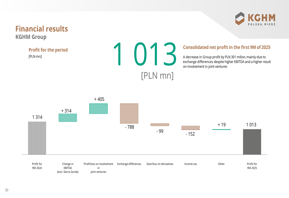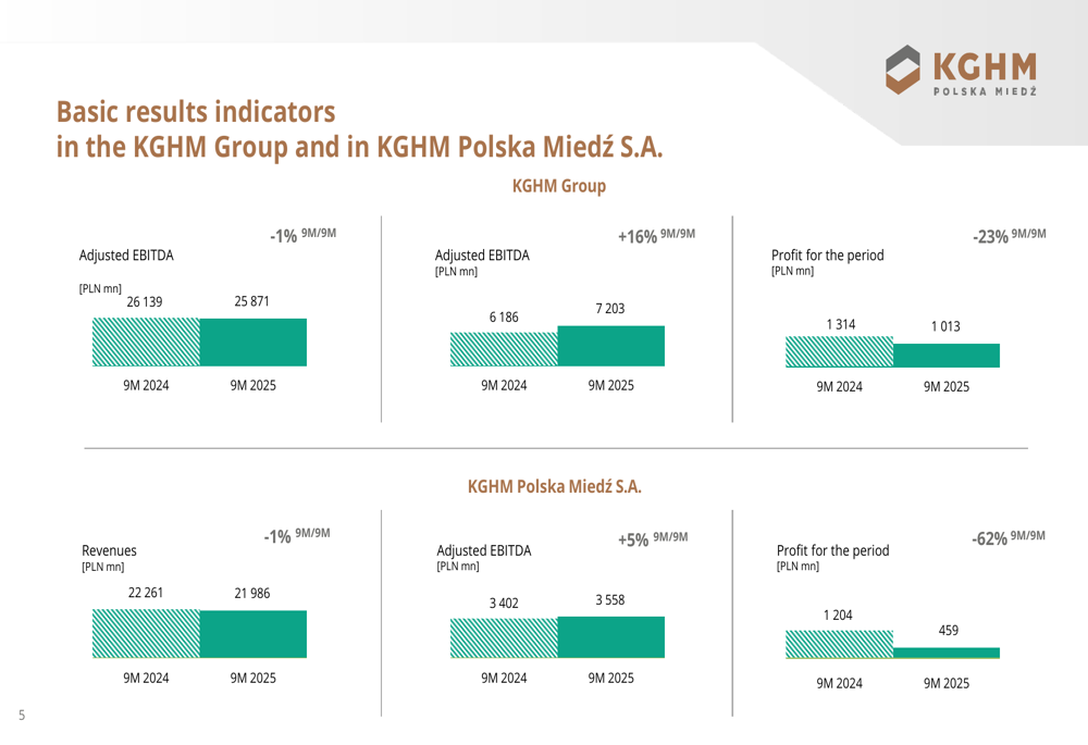 A KGHM apresentou resultados operacionais mistos para os primeiros nove meses de 2025. Enquanto o EBITDA ajustado do Grupo aumentou significativamente em 16% em comparação ao ano anterior, atingindo 7.203 milhões de PLN, as receitas diminuíram ligeiramente em 1% para 25.871 milhões de PLN. O lucro do período caiu 23% para 1.013 milhões de PLN, principalmente devido às diferenças cambiais.