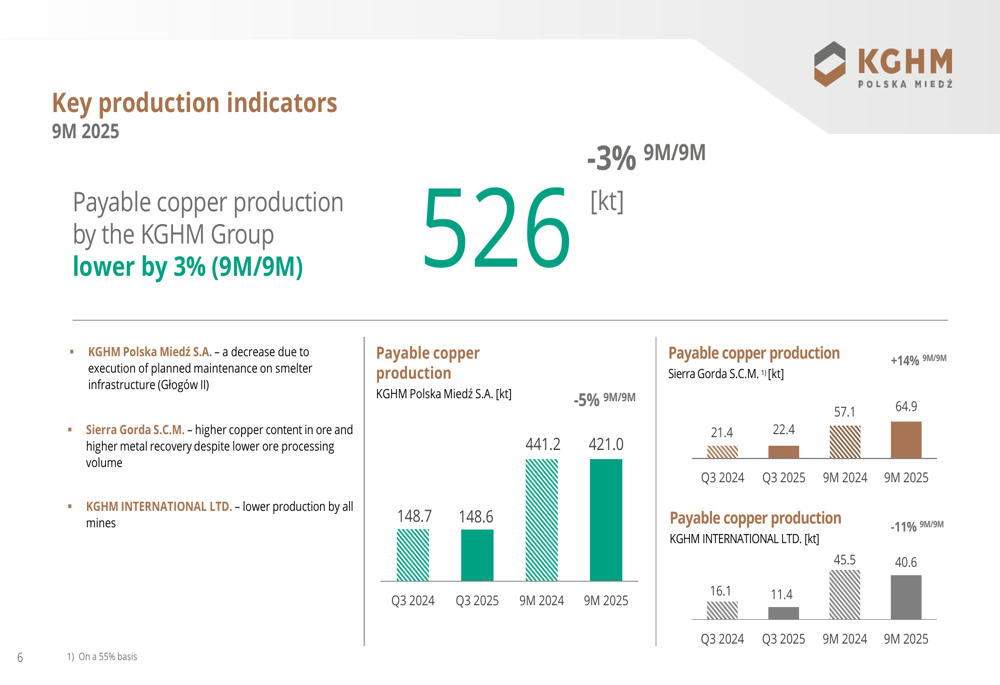 No front de produção, a produção total de cobre pagável pelo Grupo KGHM diminuiu 3% para 526 kt em comparação com o mesmo período em 2024. Essa queda foi impulsionada principalmente pela menor produção na KGHM Polska Miedź S.A. (-5%) e KGHM INTERNATIONAL LTD. (-11%), parcialmente compensada por um aumento de 14% na Sierra Gorda S.C.M.
