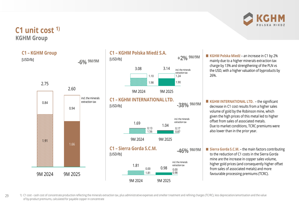 O desempenho melhorado do EBITDA da KGHM demonstra o foco da empresa na eficiência operacional e controle de custos. O custo unitário C1 para o Grupo KGHM diminuiu 6% em relação ao ano anterior para US$ 2,60/lb, com reduções particularmente impressionantes na KGHM INTERNATIONAL LTD. (-38%) e Sierra Gorda S.C.M. (-46%).