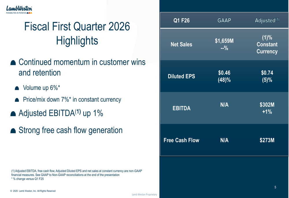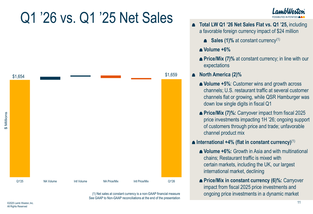 O CEO Mike Smith enfatizou o foco da empresa na implementação da estratégia Focus to Win com urgência, incluindo o Programa de Redução de Custos, enquanto impulsiona o crescimento contínuo de volume e o momentum com os clientes. A empresa mantém-se comprometida em trazer produtos inovadores ao mercado, estabelecer parcerias com clientes e implantar recursos onde a Lamb Weston se diferencia.