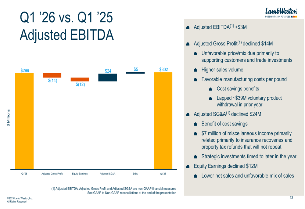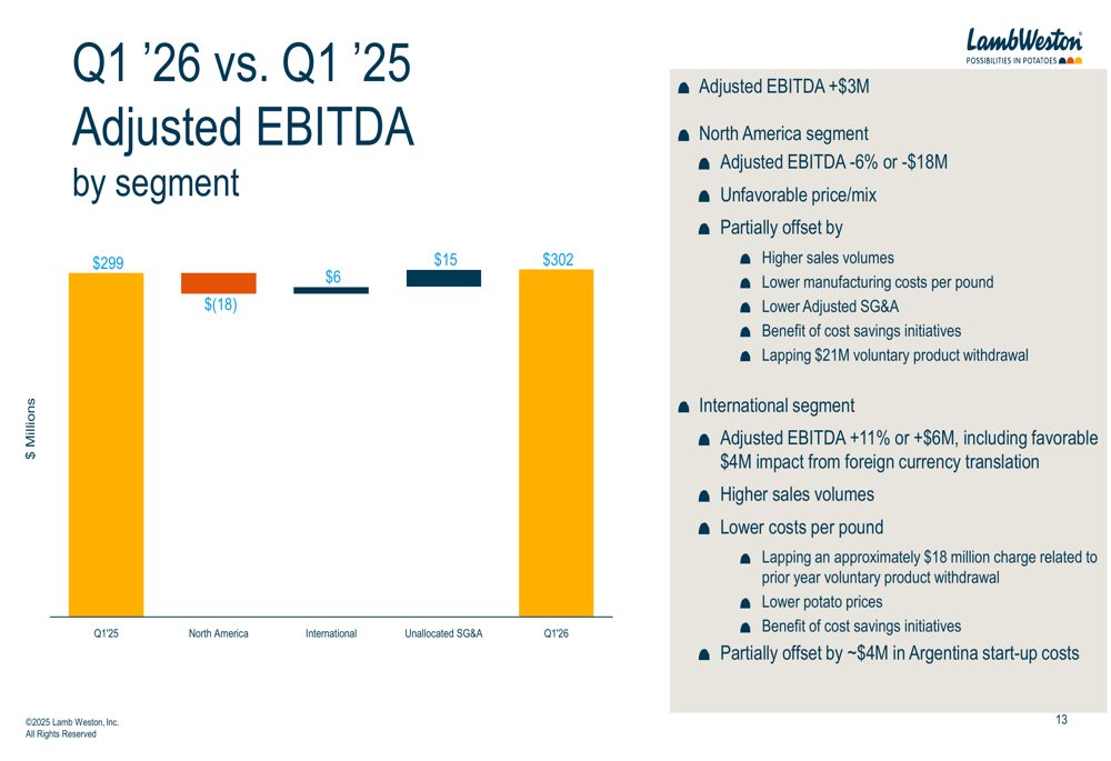 O EBITDA ajustado da Lamb Weston aumentou em US$ 3 milhões para US$ 302 milhões no 1º tri de 2026, representando uma melhoria de 1% em relação ao ano anterior. Esse crescimento ocorreu apesar de significativas pressões de preços, pois a empresa se beneficiou de maiores volumes de vendas, custos de fabricação favoráveis por libra e menores despesas de SG&A.