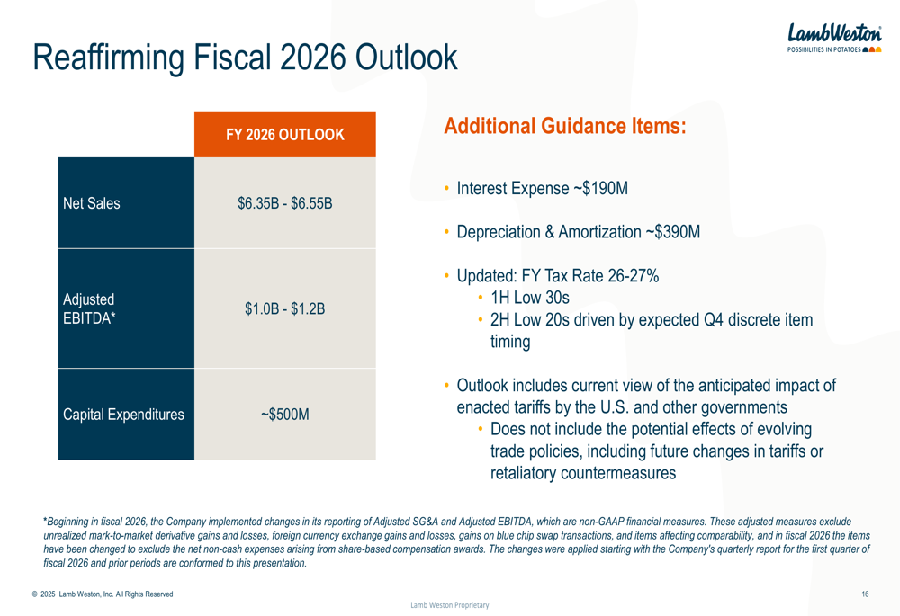 A Lamb Weston reafirmou suas perspectivas para o ano fiscal de 2026, projetando vendas líquidas entre US$ 6,35 bilhões e US$ 6,55 bilhões, e EBITDA ajustado entre US$ 1,0 bilhão e US$ 1,2 bilhão. A empresa também atualizou sua orientação de taxa efetiva de imposto para 26-27% para o ano completo, com uma taxa mais alta no primeiro semestre (baixos 30%) e uma taxa mais baixa no segundo semestre (baixos 20%) devido ao momento esperado de itens discretos no quarto trimestre.