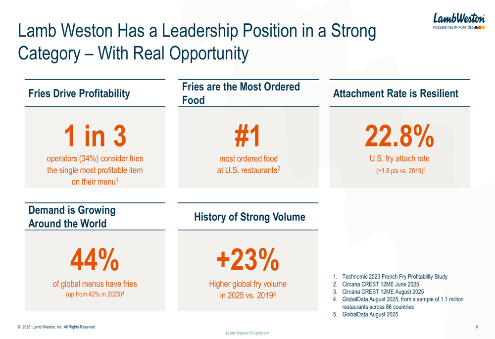 A Lamb Weston destacou sua forte posição na categoria de batatas congeladas, que continua mostrando resiliência e crescimento globalmente. A apresentação da empresa enfatizou que as batatas fritas permanecem um item de menu altamente lucrativo, com um em cada três operadores considerando as batatas fritas o item mais lucrativo em seus cardápios.