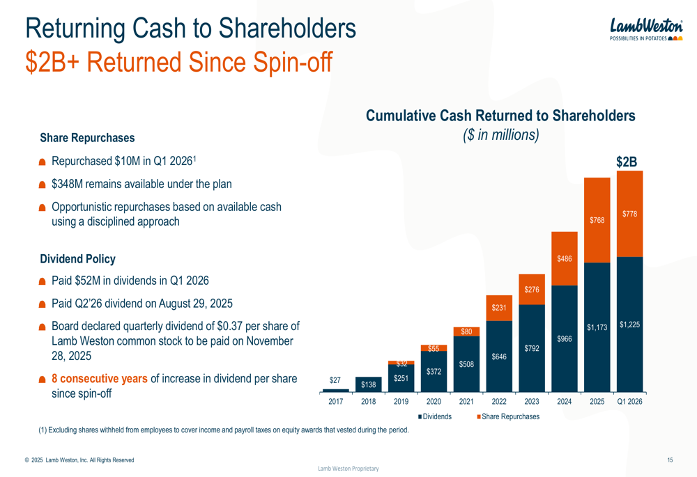 A Lamb Weston retornou mais de US$ 2 bilhões aos acionistas desde sua cisão, com oito anos consecutivos de aumento de dividendos. A empresa mantém um índice de alavancagem de 3,1x dívida líquida para EBITDA ajustado, com aproximadamente US$ 3,9 bilhões em dívida líquida. A liquidez disponível inclui US$ 99 milhões em caixa e equivalentes e US$ 1,3 bilhão em disponibilidade sob sua linha de crédito rotativo.