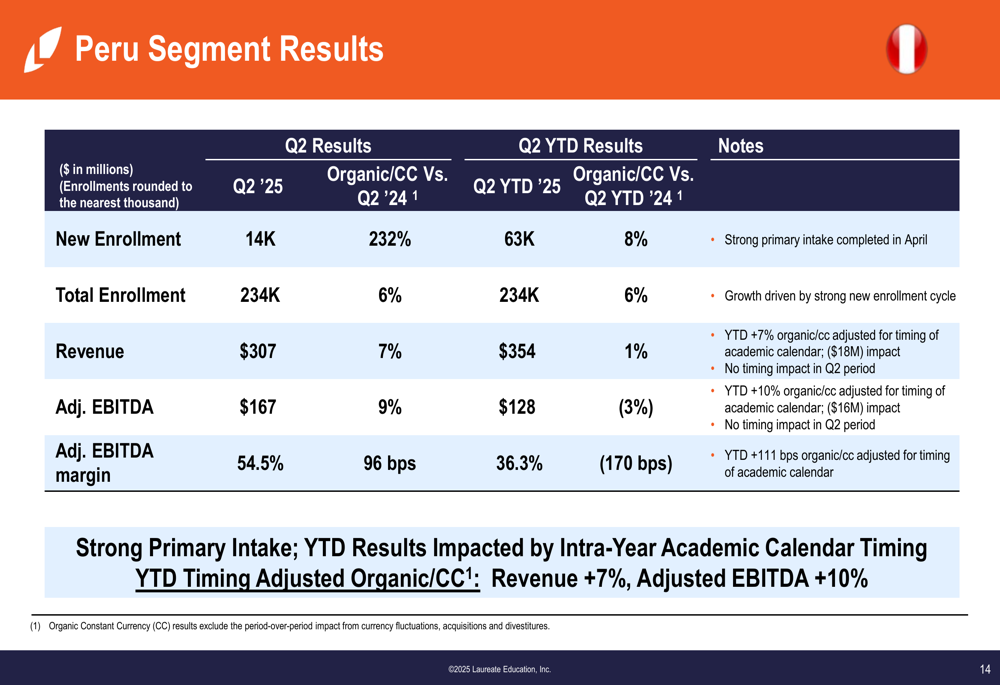 No Peru, novas matrículas mostraram crescimento dramático de 232% no 2º tri, principalmente devido ao momento da segunda entrada que foi concluída em abril. No acumulado do ano, novas matrículas cresceram 8%. A receita aumentou 7% em base orgânica/moeda constante no 2º tri, enquanto o EBITDA ajustado cresceu 9%. O segmento Peru entregou uma impressionante margem de EBITDA ajustado de 54,5% no 2º tri.