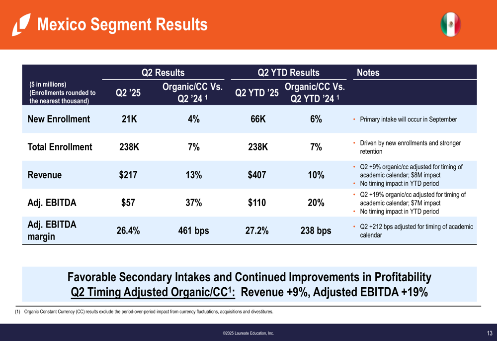 Os resultados financeiros foram positivamente impactados pelo momento das despesas e fortalecimento do peso mexicano (MXN) e do sol peruano (PEN). Quando ajustado para o calendário acadêmico, a receita orgânica/moeda constante do 2º tri cresceu 8% e o EBITDA ajustado aumentou 13%.
