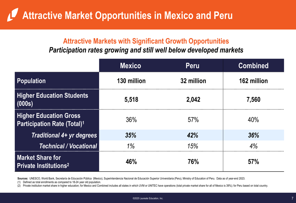 A Laureate Education mantém uma posição de liderança na educação superior privada no México e Peru, com um portfólio de instituições premium e orientadas para valor. A empresa atende uma população combinada de 162 milhões de pessoas nesses mercados, onde as taxas de participação no ensino superior permanecem abaixo daquelas de países desenvolvidos, sugerindo significativo potencial de crescimento.