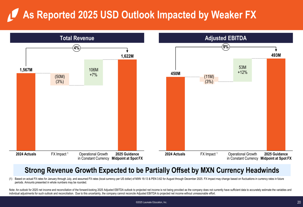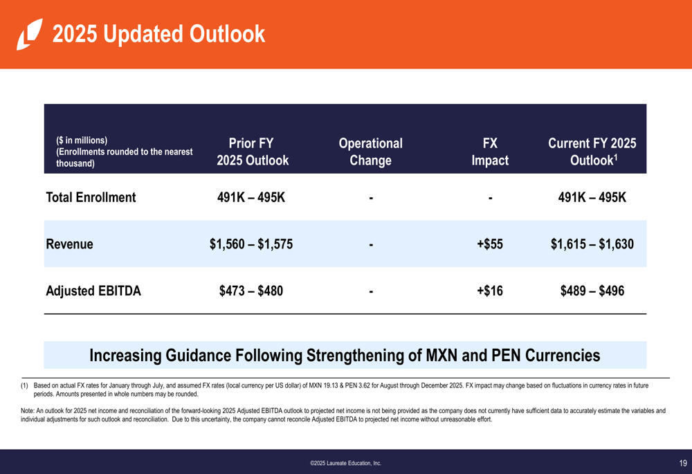 Com base no forte desempenho e movimentos favoráveis de câmbio, a Laureate aumentou sua orientação para o ano completo de 2025. A empresa elevou sua perspectiva de receita em US$ 55 milhões para US$ 1.615-1.630 milhões e a orientação de EBITDA ajustado em US$ 16 milhões para US$ 489-496 milhões, enquanto manteve sua projeção de matrículas de 491.000-495.000 estudantes.